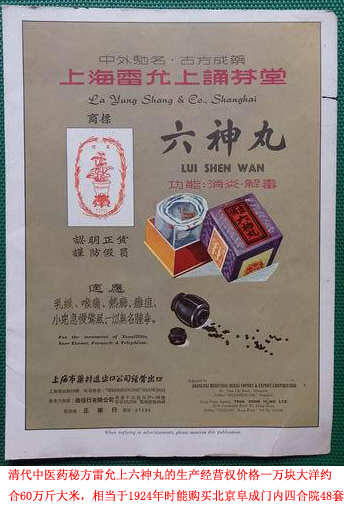 清代秘方同樣價值巨大,價格極高。據《蘇州雷允上與六神丸》(原載2010年6月4日《揚子晚報》)一文介紹,雷允上史志記載,清同治年間,吳門名醫雷允上後裔雷滋蕃結識了一位姓顧的昆山人,兩人交誼日厚。後老人贈其一張由六味藥組成的秘方,雷滋蕃獲此秘方後,在蘇州通和坊加工制作成丸藥,並定名為“雷滋蕃牌六神丸”。這就是後來名震醫壇、無人不知的六神丸配方。因六神丸的特殊性,其配方是嚴格保密的,只有傳人一人掌握,並且傳兒不傳女,幾百年來,一直保持著獨家經營的地位。清光緒二十八年(1902年),雷氏家族拿出現資大洋一萬塊,一次性買斷六神丸生產經營權。後來顧姓老人故世,雷家另酬謝顧家10萬兩白銀。據孟天培、甘博《二十五年來北京之物價、工資及生活程度》一文介紹,1912年時北京的一塊大洋能買60斤普通大米,大洋一萬塊則能購買60萬斤普通大米。據《老北京的天價房 看看以前的軍機大臣如何炒房》(見2015年05月28日《中國經營報》)一文中,指出清末民國初期, 10萬兩白銀約合大洋15萬塊,約能購買900萬斤大米。可以說,雷氏家族用約960萬斤大米的價格,才將一個六神丸秘方歸為己有。