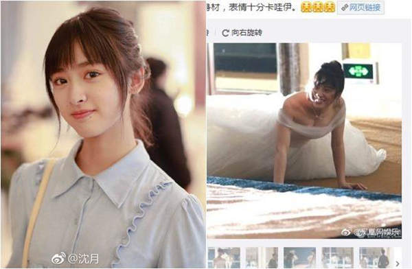 網絡上瘋傳的一組新版《流星花園》劇照,照片中女主角沈月穿著婚紗與飾演道明寺的王鶴棣同框,沈月更不知道為何整個人狼狽跌落在地,網友驚呼原來外型清新的沈月身材如此好!