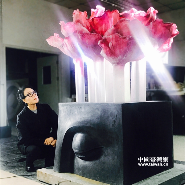本次展覽最具“分量”的作品為楊惠姍于今年初完成的高180厘米、重達1.2噸的《共生大愛》。這件作品底部是低眉觀想的慈悲人像,頂部的一支支琉璃柱,成為了一束束的光,綻放出一瓣瓣的茶花花瓣。茶花,意寓有謙遜、有理想的愛,表達對這個世界的包容與關懷。在同一片大地上孕育的每片花瓣,相互輝映生長;每個人就是一片花瓣,彼此扶持茁壯,共成美好,體現“共生”的概念。琉璃柱上的文字,出自《莊子﹒齊物論》,呼應了“共生”,也傳達了東方藝術家對世界、對生命的愛與關懷。