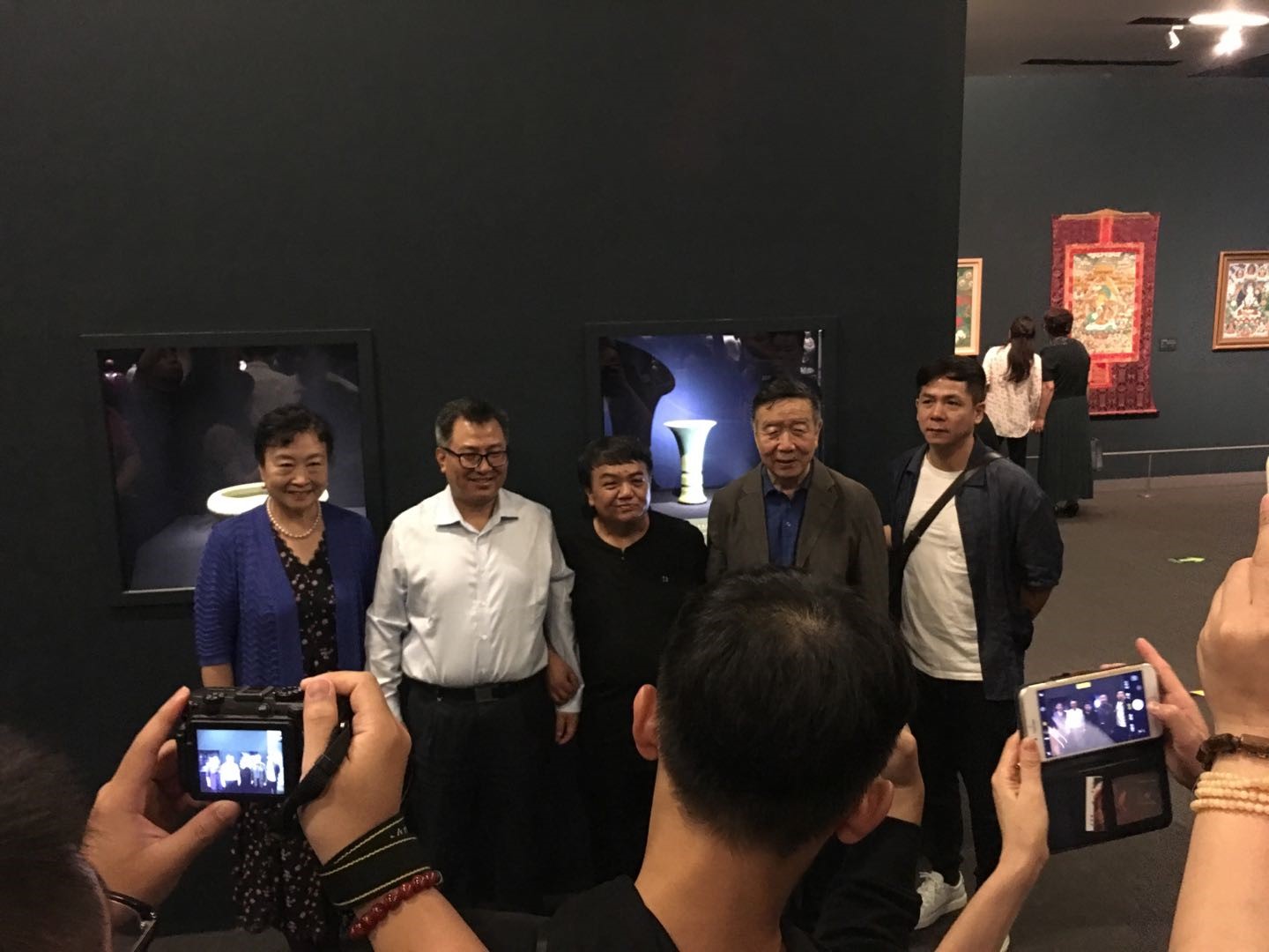何志隆(中)與中國國家博物館館長王春法(左二)、故宮博物院前院長鄭欣淼(有二)在工藝美術作品展現場。 (中國臺灣網 發)