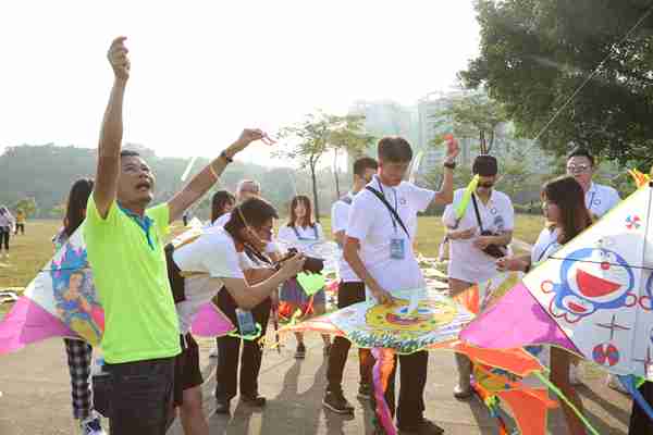 兩岸青年在興致勃勃地準備放風箏比賽。