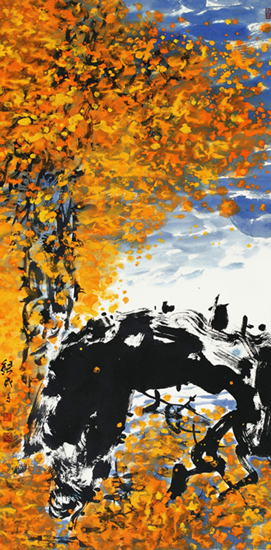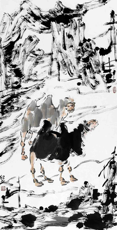 張錄成繪畫之與眾不同,豈止僅僅體現在其大寫意作品上。他對牛、馬、駱駝、大漠、胡楊符號的提煉,他的每一筆蹤墨跡,他的繪畫圖式、墨色表達等,皆追求個人風格、獨家之貌,就是信手小品也每每重立意境、改變筆墨、新構圖式。