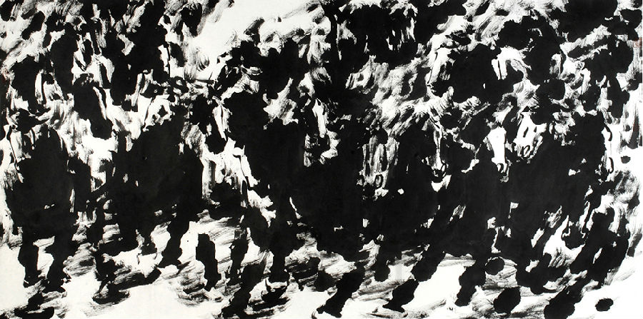 張錄成的大寫意謂之真寫意,既意在筆先——熱血沸騰、激情澎湃,又筆墨超然——酣暢淋漓、瀟灑狂放,還簡約單純——極致提煉、高度概括。比如,他的《跨越》《胡楊魂》,又比如,他的《天馬行空圖》《塔克拉瑪幹野駝》,還比如,他的《萬馬蹄飛如雪來》《汗血印象係列》……