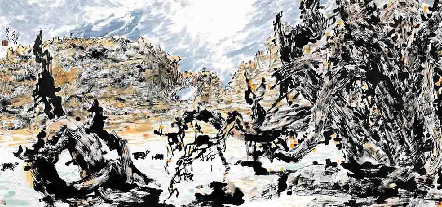 傳統繪畫具有諸多繁復的筆墨體式、反復的皴擦、細密的點染,以及精致的勾勒等筆墨特點,而張錄成繪畫追尋大漠之魂、拜謁絲路文明,感悟蒼涼、悲壯、雄渾、孤寂、曠遠與浩渺,以枯墨、焦墨、渴筆、潑墨、濃墨、淡墨及淩亂、衝撞的線條之筆墨語言,形成了大開大合、恣意奔放、高古荒寒,以至無法之法、亂而不亂的反傳統、反規律、反秩序的筆墨特徵。