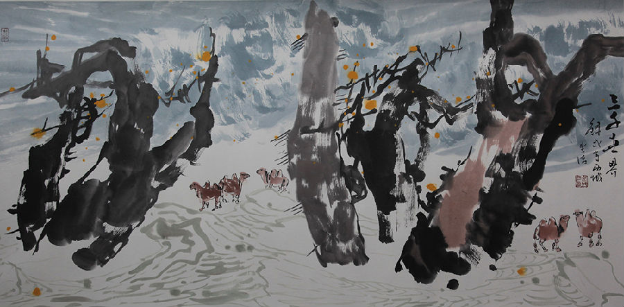張錄成對傳統繪畫的突破集中體現在他的代表作中,比如《跨越》《輝煌千秋》,又比如《古道佛光》《胡楊魂》,還比如《荒天枯木寒》《塔克拉瑪幹野駱駝》……