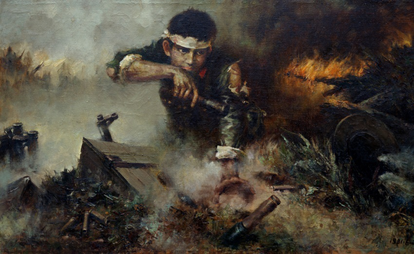 認識王立平,緣自一張畫。這張畫,刻骨銘心,如魂牽夢繞。畫面是我邊境自衛反擊作戰中,一場激戰的局部特寫,震耳欲聾的炮彈,交織橫飛的子彈,硝煙彌漫中,一位頭部嚴重負傷的士兵,抓起一枚手榴彈,咬斷引火線,用盡全力投向又一次試圖衝上來的敵人……畫面中噴火的眼神,叩緊的牙齒,滴血的繃帶,爆裂的軍裝,嵌進泥土的手指,還有,戳立的武器,傾斜的彈藥箱,散亂的彈藥,燃燒的車輛,濃烈的硝煙,無不顯示戰爭的殘酷,士兵的英勇,也無不展現畫的真實,畫的厚重。
