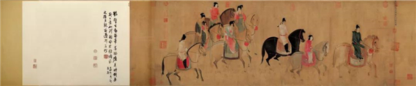 《虢國夫人遊春圖》描繪了天寶年間唐玄宗寵妃楊玉環的姐姐虢國夫人和秦國夫人攜其侍從春遊的場景。