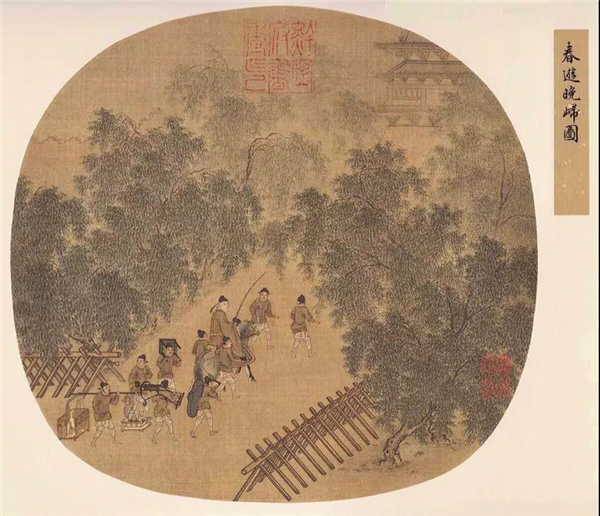 《春遊晚歸圖》中繪一男性官員春遊回府,前後簇擁著10名侍從,他們或搬椅、或扛兀、或挑擔、或牽馬,一片晚歸時的欣然場景。官員持鞭回首,倣佛意猶未盡,表現出南宋官僚安于江南時的悠閒生活,令人想起南宋林升《題臨安邸》一詩: