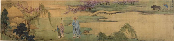 《山徑春行圖》為邊角之景,繪春日漫步山徑的怡然之樂。此畫尺幅較小,卻留下大片空白,突出了畫家經營位置之高明,馬遠通過以虛寫實,疏密而量的手法,將遠處之景籠罩于迷霧之中,似有“暖漲一川春霧綠。白鳳徘徊清淑。似沉水無煙,礜湯千斛”之感,空白之處反而為畫面增添了不少詩意。畫中的主人公,悠然自得,緩步而行,若臨春風。