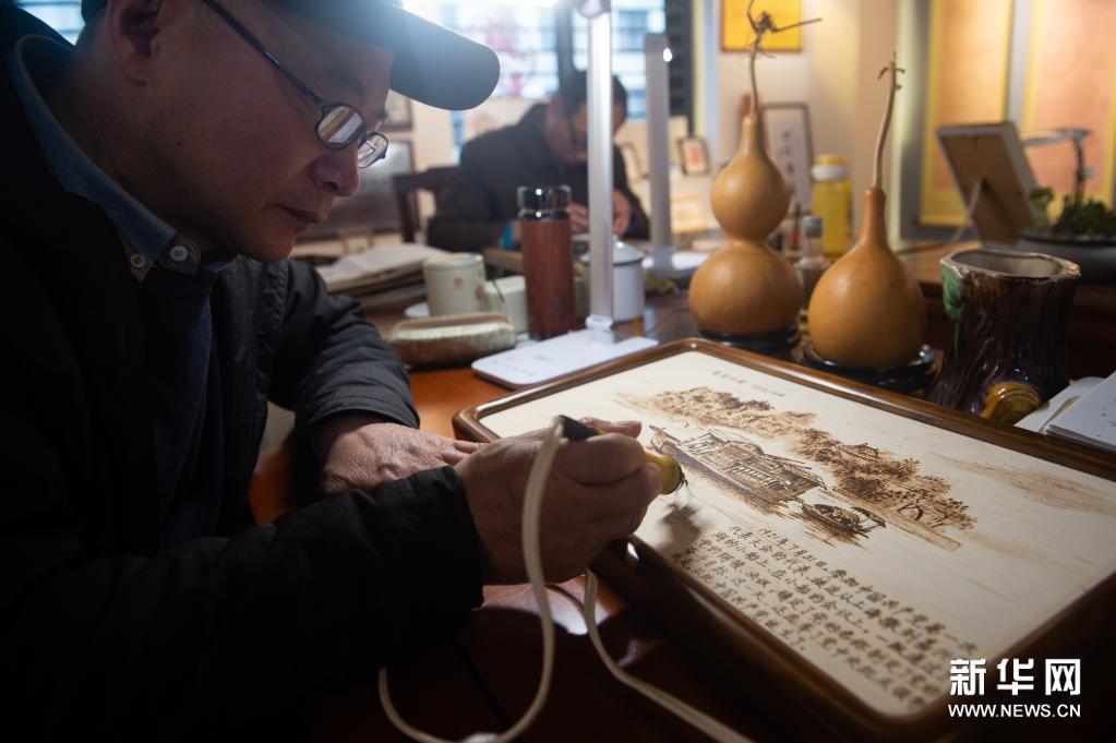 4月1日,在合肥市明光路街道非遺工作室,安徽省葫蘆烙畫省級傳承人鄭小良在制作以“南湖紅船”為主題的烙畫。為展現中國共產黨的百年光輝歷程,合肥市明光路街道非遺工作室的非遺傳承人用烙畫、核雕、鐵字、木版水印等非遺技藝創作一批作品重溫百年黨史。新華社記者 杜宇 攝