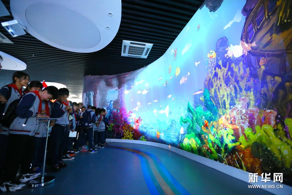 5月13日,山東省青島長江學校小學部的學生們來到位于青島藍谷的海洋科技展館內,通過參觀海洋裝備、體驗科技遊戲、聽“蛟龍”號科考故事等形式學習海洋知識,培養對海洋科技的興趣愛好。新華社發(梁孝鵬 攝)