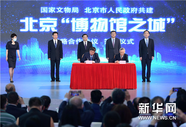 國家文物局黨組成員、副局長關強與北京市政府黨組成員、副市長楊斌現場簽署《國家文物局 北京市人民政府共建北京“博物館之城”戰略合作協議》(新華社記者 李賀 攝)