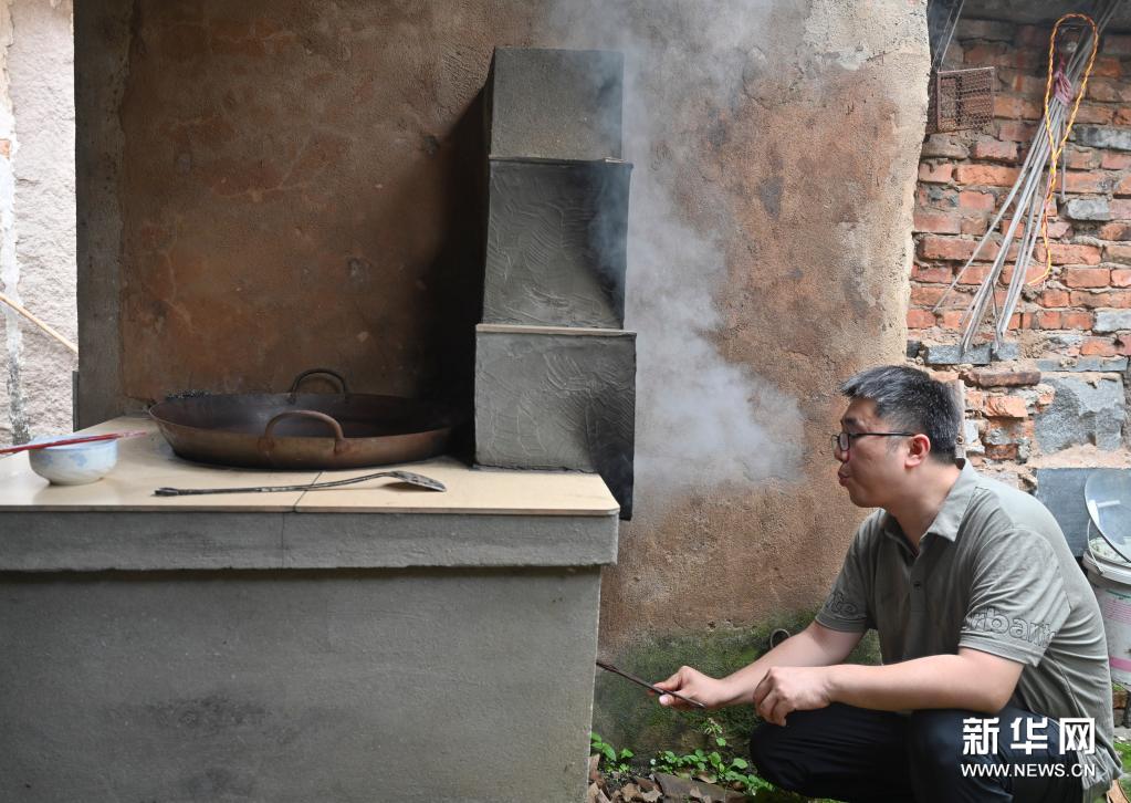 5月21日,在福建省福州市長樂區古槐鎮高樓村,陳國銳生火準備熬制作為粘合劑的米糊。新華社記者 宋為偉 攝