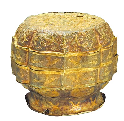 鎏金雙鳳紋帶蓋銀盒是這批文物中的珍品。銀盒通體鎏金,蓋面高高隆起,似一朵覆蓋的蓮花。蓋面錘刻花紋以銜草翱翔的雙鳳為主體,周圍環繞8對飛雁,並間以纏枝蓮紋和魚子紋。蓋口沿和盒身上腹部均刻有8對奔鹿,下腹部鏨刻8朵牡丹團花。高圈足一周刻10只大雁,足邊緣刻變體蓮瓣紋帶。