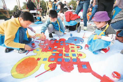 在家長的陪伴下,孩子們在南京科技館繪制非遺畫卷。