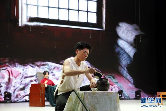 6月1日,中學生在表演話劇《駱駝祥子》片段。