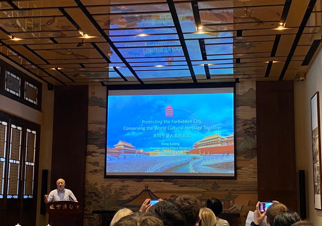 故宮博物院院長王旭東向駐華外交官介紹故宮的建築特色。新華社記者潘潔 攝