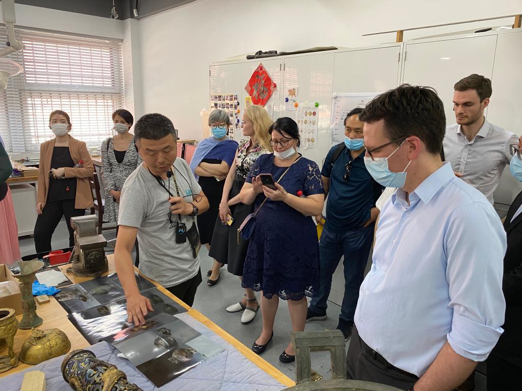 匈牙利駐華使館參讚宋妮雅是一名考古學家。在青銅器修復室,她饒有興趣地向工作人員詢問修復細節。“中國的文物修復方式和標準與我們不太一樣,很受啟發。”