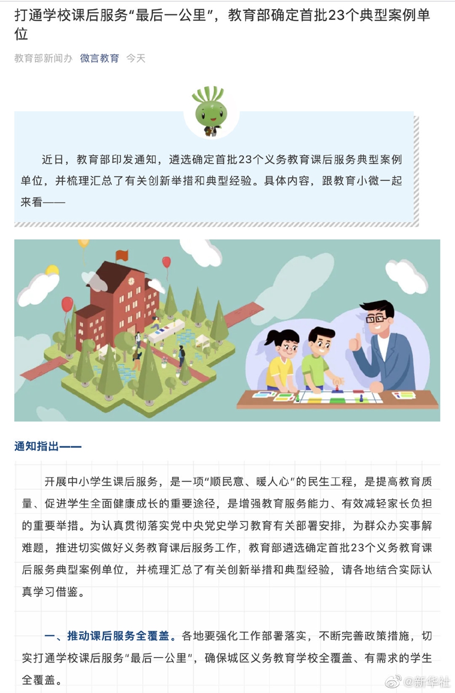 教育部:中小學課後服務結束時間原則上不早于正常下班後半小時