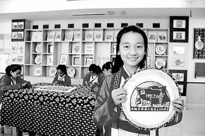 山東淄博高青縣實驗小學學生展示自創的建黨100周年剪紙作品。張陶攝/光明圖片