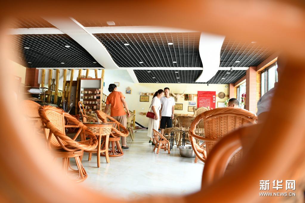 7月10日,在遵義市匯川區板橋鎮婁山關社區,遊客在一家藤編產品專賣店選購產品。藤編技藝是遵義市級非物質文化遺產。近年來,貴州省遵義市匯川區板橋鎮採取“支部+產業+農戶+旅遊”的生產經營模式,建立非遺工坊,成立藤編產業協會,開展技能培訓,開設旅遊商品門面,不斷發展壯大藤編產業,助力群眾增收。新華社發(羅星漢 攝)