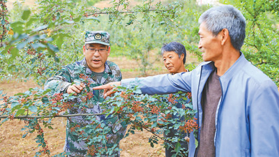 張洪峰(左一)和群眾一起探討花椒培育技術。