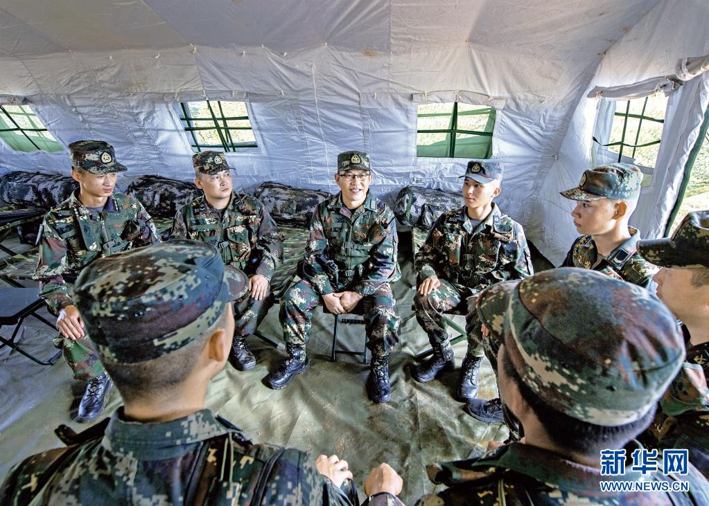 火箭軍某導彈旅旅長周勇坤(左三)在野外帳篷里與執行任務官兵談心(5月26日攝)。新華社發(劉明松 攝)