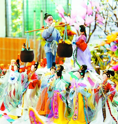 七夕節乞巧賽藝是廣州市傳統民俗。自2013年以來,每年七夕來臨之際,當地都會舉辦“廣州乞巧賽藝會”。圖為賽藝會上塑造牛郎織女鵲橋會情景的作品。光明圖片/視覺中國