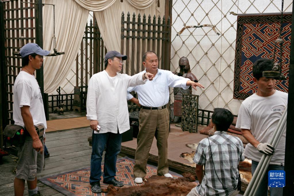 葉錦添(左二)與導演吳宇森(中)在電影《赤壁》拍攝期間交流(資料照片)。新華社發(受訪者提供)