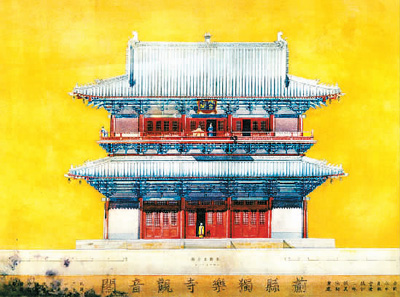 梁思成繪薊縣獨樂寺觀音閣南立面水彩渲染圖,中國文化遺產研究院藏。