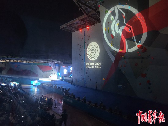 本屆全運會攀岩比賽幾度因雨延期、改期,但觀眾對攀岩賽場的“迷戀程度”還是給記者留下深刻印象:9月20日晚,攀岩賽場16歲以下組女子兩項全能比賽臨近尾聲時風雨突至,內場區域的兩支陽傘已經被刮到觀眾席上,競賽委員會緊急商定隨後的男子成年組速度賽取消,但觀眾仍然不願離開賽場,“這比賽有意思,好看”,是讓上百名觀眾在雨中駐足等待風雨過後,比賽重新開始的唯一理由——據記者了解,攀岩賽場的體育展示團隊“對標”的是2019年在日本舉行的攀岩世錦賽,這使得全運會攀岩賽場除了競技比拼之外,更像是一場精彩的表演:展示團隊精心制作的視頻內容通過投影投射到接近20米高度的岩壁上,觀眾不但可以了解攀岩的專業知識,還可以欣賞到陜西地道的“華陰老腔”——老腔剛直高亢、磅薄豪邁:“夥計們,帶上你的裝備,來攀岩哎!”