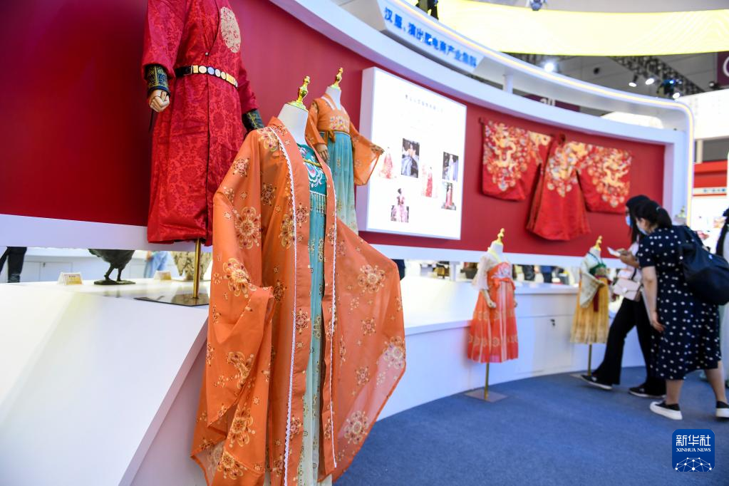 9月23日,參觀者在第十七屆文博會山東展臺了解曹縣相關企業制作的漢服。新華社記者 毛思倩 攝