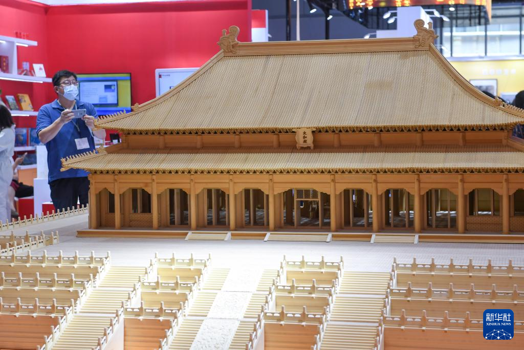 9月23日,參觀者在第十七屆文博會上觀看太和殿模型。新華社記者 毛思倩 攝