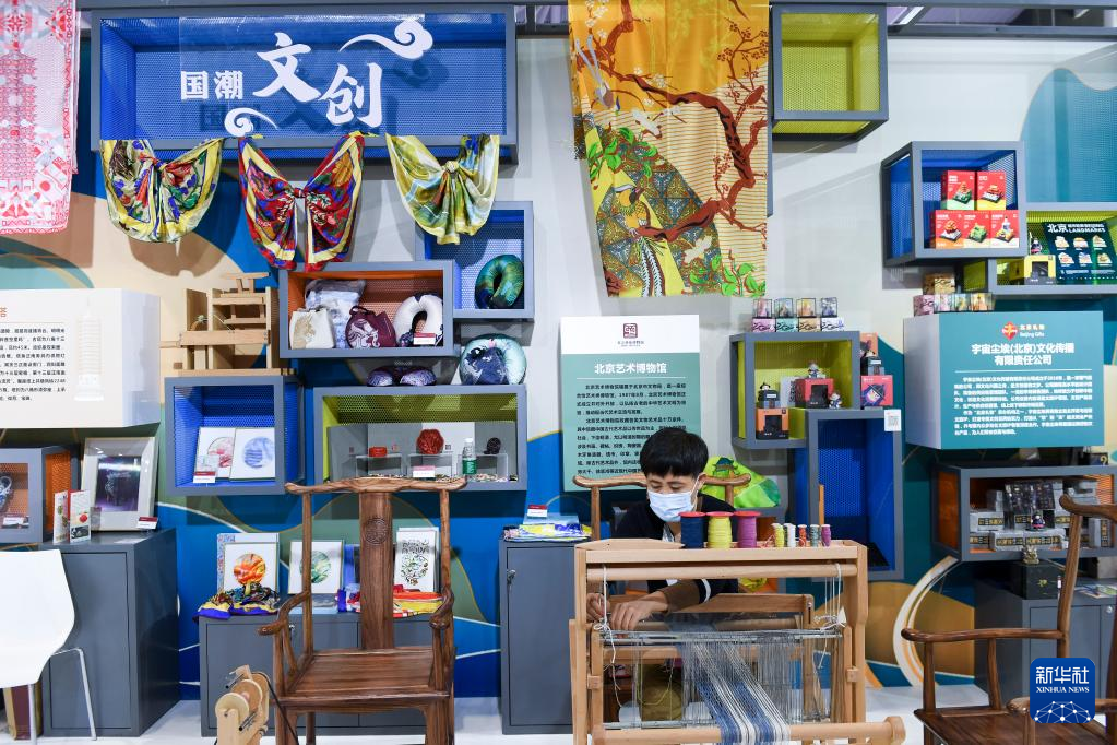 9月24日,工作人員在第十七屆文博會北京展臺演示傳統織布手藝。新華社記者 毛思倩 攝