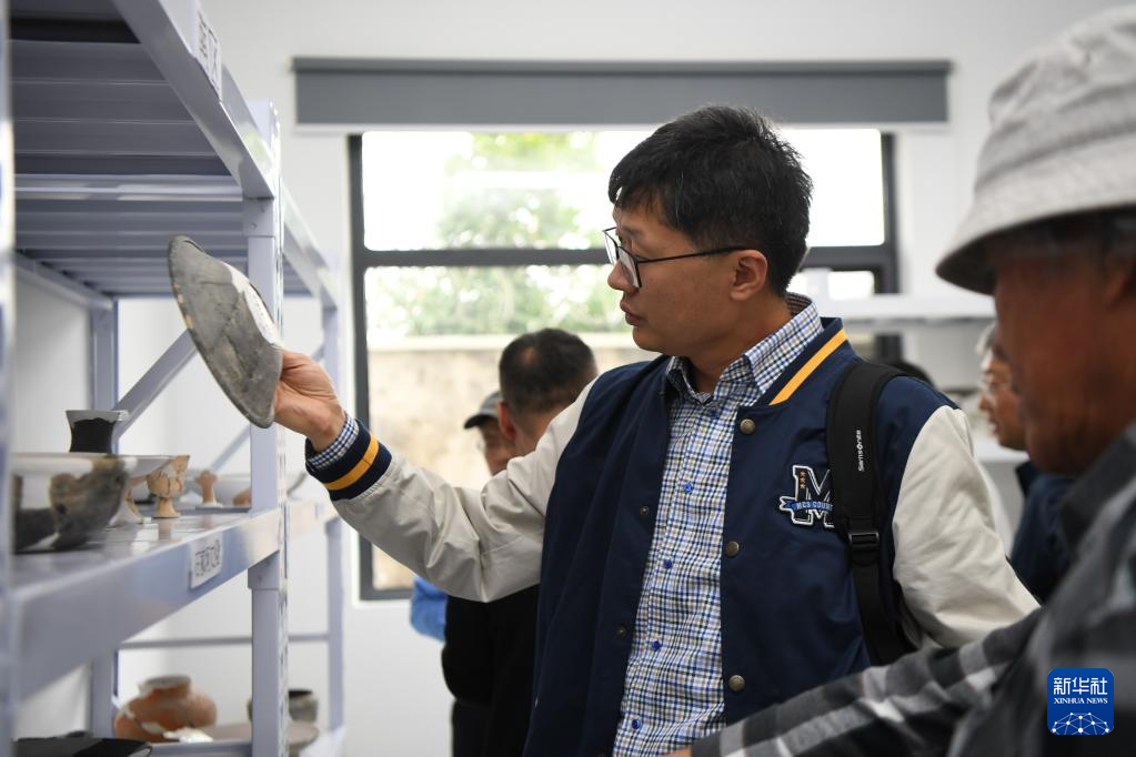 10月9日,幾名專家在湖南常德澧縣澧陽平原考古工作站查看雞叫城遺址出土的陶器。新華社記者 薛宇舸 攝