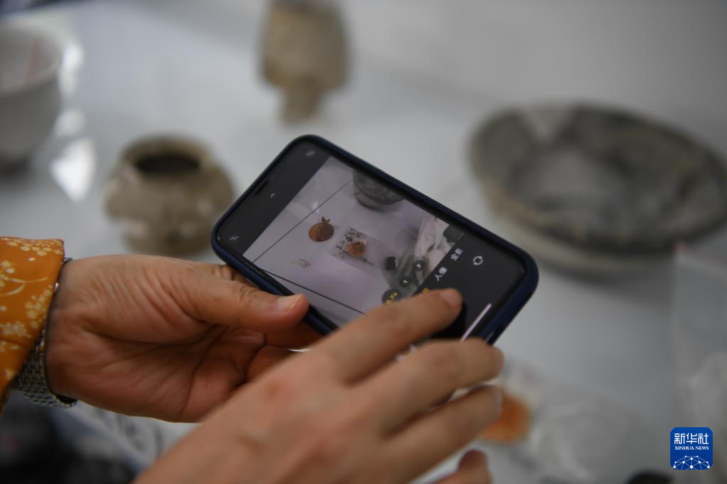 10月9日,一名專家在湖南常德澧縣澧陽平原考古工作站拍攝雞叫城遺址出土的陶器。新華社記者 薛宇舸 攝