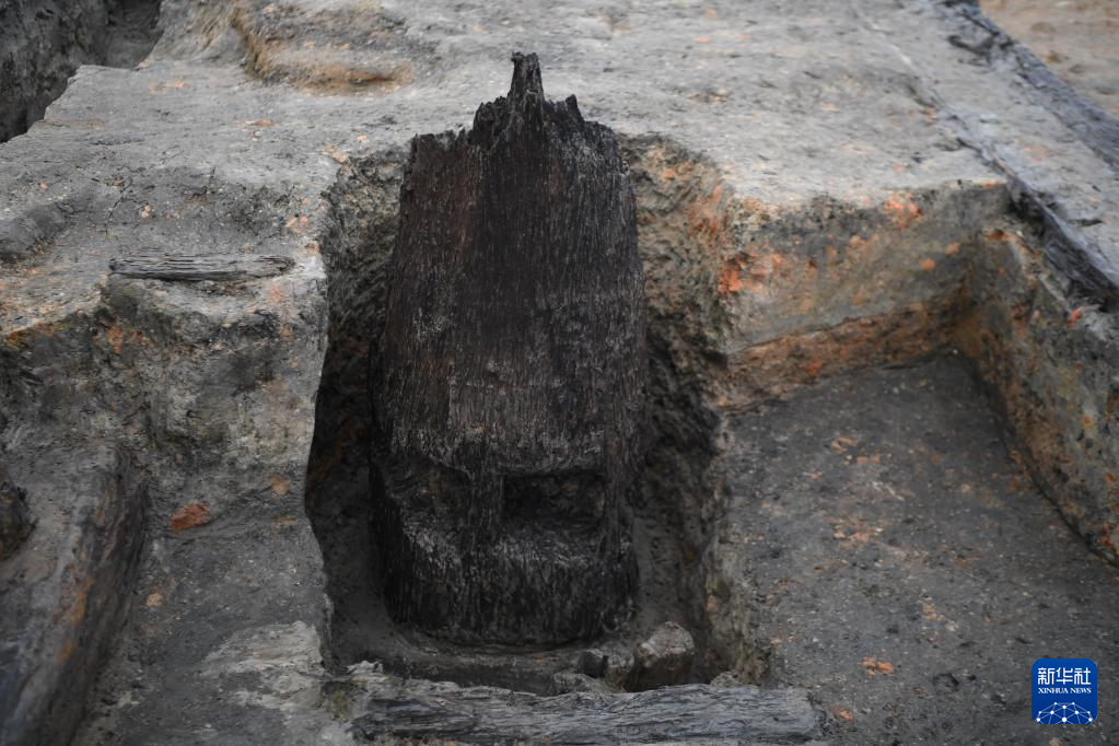 這是10月9日拍攝的湖南常德澧縣雞叫城遺址內的一根木柱。新華社記者 薛宇舸 攝