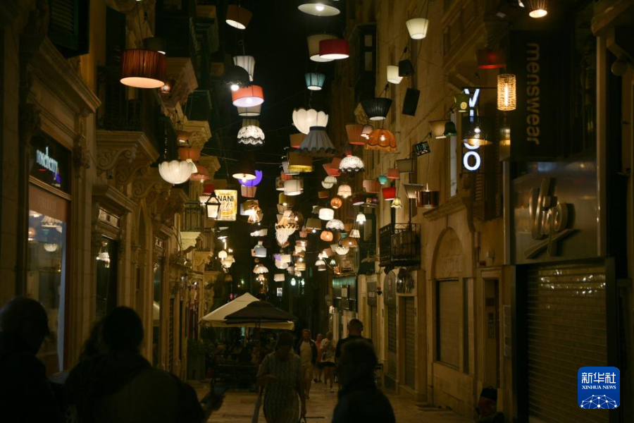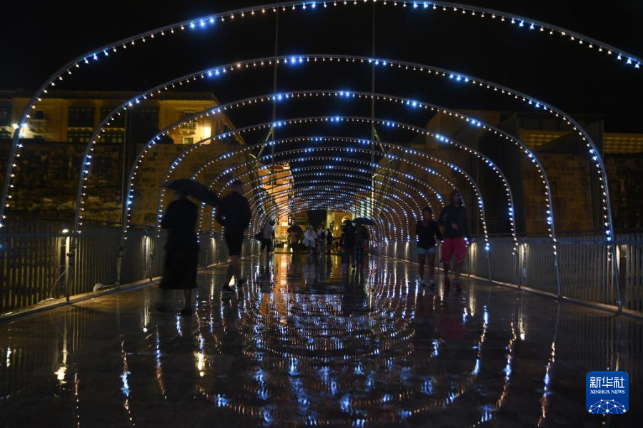 10月13日,人們走在馬耳他首都瓦萊塔一條用燈光裝扮一新的街道上。新華社發(喬納森·博格攝)