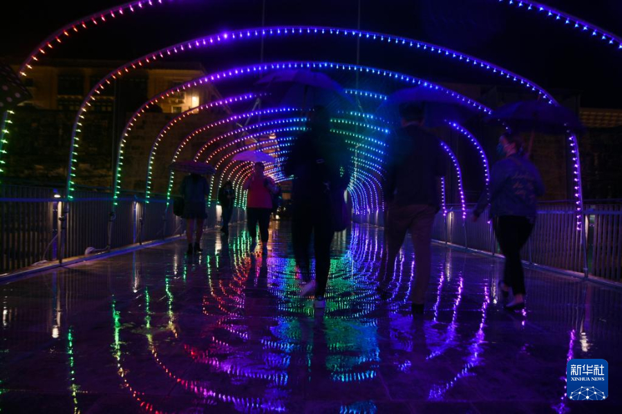 2021年10月13日,人們走在馬耳他首都瓦萊塔一條用燈光裝扮一新的街道上。 馬耳他國家遺產、藝術和地方政府部下屬機構“節日馬耳他”發起了一項名為“點亮瓦萊塔”的全新活動,在10月1日至10月17日期間,首都瓦萊塔的行人街道和廣場被五顏六色的燈光裝點,讓人們盡情享受古城燈光璀璨的夜晚。 新華社發(喬納森·博格攝)