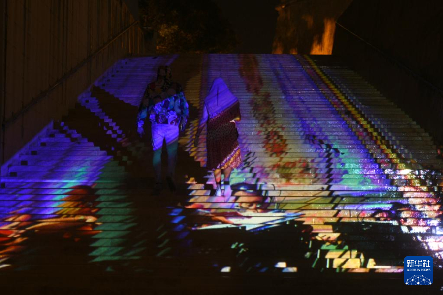 10月13日,人們走在馬耳他首都瓦萊塔一處用燈光裝扮一新的臺階上。 新華社發(喬納森·博格攝)