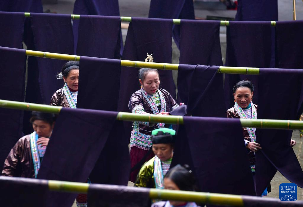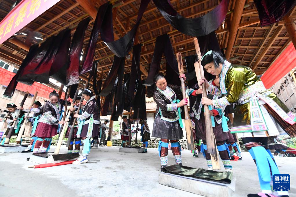 10月19日,在桂黔烏英苗寨亮布文化節上,苗族婦女向觀眾展示捶打亮布。當日,在廣西柳州市、融水縣兩級婦聯、民宗、水利等部門以及柳州市女企業家協會的支持下,位于桂黔交界的大苗山深處的烏英苗寨舉辦第二屆亮布文化節,並開始籌建亮布制作基地和博物館,以更好地保護、傳承和發展這項傳統手工藝。 亮布是當地苗族傳統手工布料,制作要經過浸染、捶打、晾曬和涂蛋清等多道工序。亮布制成後可長久保持光澤。因制作工藝復雜、耗時長久,傳統亮布曾一度淡出人們的視野。近年來,隨著文旅產業的發展和傳統文化的復蘇,傳統亮布制作技藝重現生機。新華社記者 黃孝邦 攝