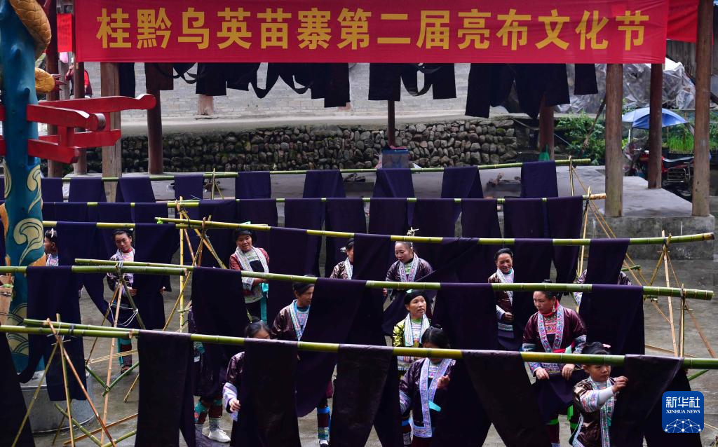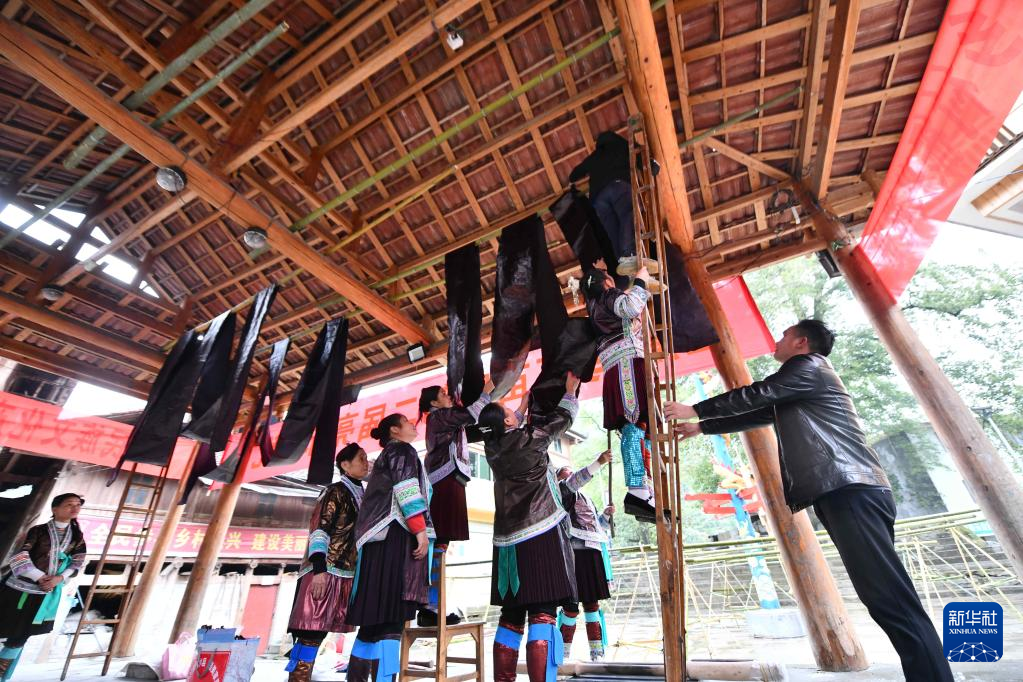 10月19日,在桂黔烏英苗寨亮布文化節上,苗族婦女在懸挂亮布。新華社記者 黃孝邦 攝