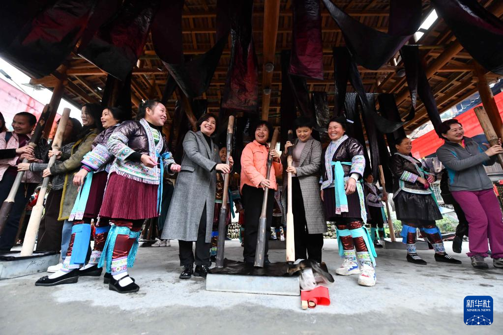 10月19日,在桂黔烏英苗寨亮布文化節上,柳州女企業家和苗族婦女一起體驗捶打亮布。新華社記者 黃孝邦 攝