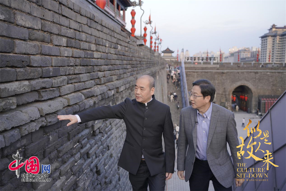 王曉輝(右一)與侯寧彬在西安城牆 中國網 記者 胡俊 攝