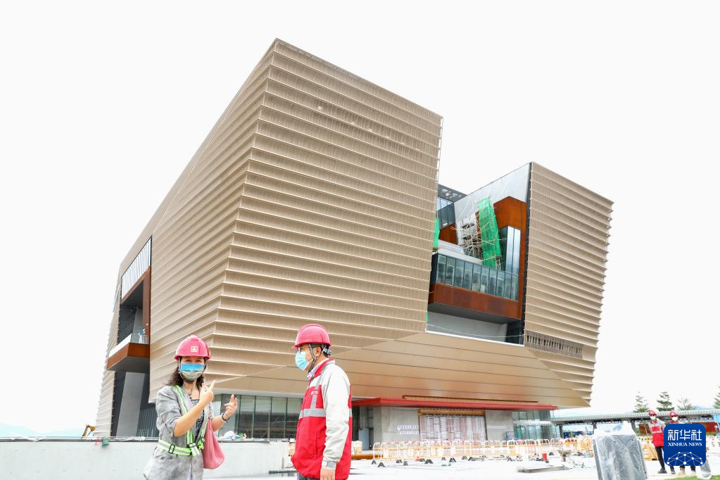 中國建築國際集團有限公司香港故宮項目負責人王勇(左一)帶領記者參觀即將竣工的香港故宮(10月22日攝)。新華社記者 吳曉初 攝