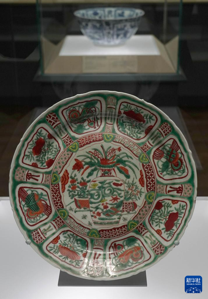 在上海博物館展出的法國吉美國立亞洲藝術博物館藏來自中國景德鎮的瓷器(10月28日攝)。10月28日,上海博物館與法國吉美國立亞洲藝術博物館合作,聯合來自7個國家的13家知名博物館及收藏機構舉辦的 “東西匯融——中歐陶瓷與文化交流特展”開幕。展出作品體現了早期全球化中貿易與文化交流的歷史。新華社記者 任瓏 攝