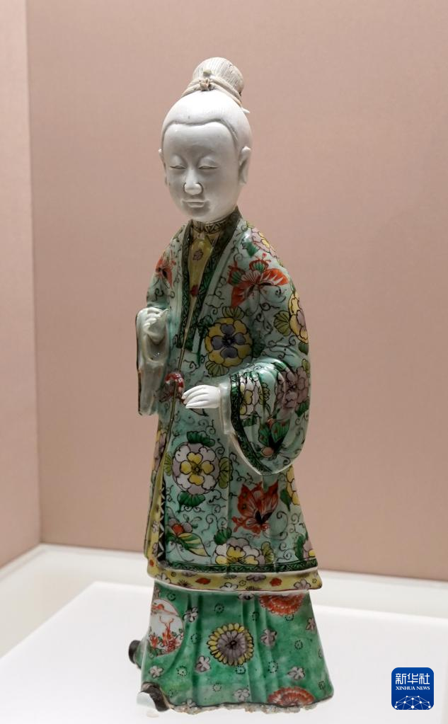 在上海博物館展出的法國吉美國立亞洲藝術博物館藏來自中國景德鎮的瓷器——五彩中國女子像(10月28日攝)。新華社記者 任瓏 攝