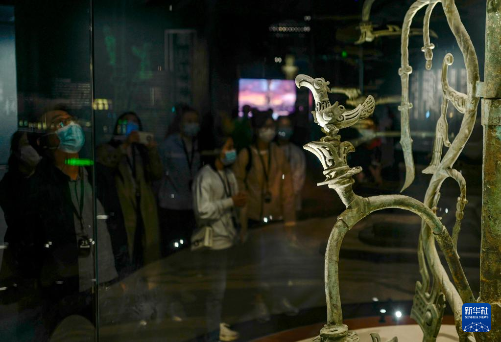 10月29日,參觀者在三星堆博物館內觀看銅神樹。新華社記者 劉潺 攝