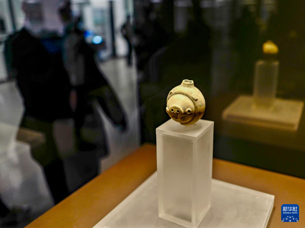 在三星堆博物館開放式文物修復館內展出的2020年四川省廣漢市南豐鎮聯合村出土的陶豬,因外形酷似遊戲“憤怒的小鳥”的小豬而走紅網絡(10月29日攝)。新華社記者 劉潺 攝
