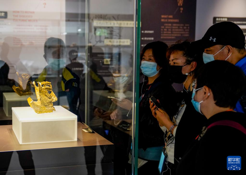 2021年三星堆遺址3號“祭祀坑”出土的金面具,在三星堆博物館開放式文物修復館內展出,吸引了眾多參觀者(10月29日攝)。新華社記者 劉潺 攝
